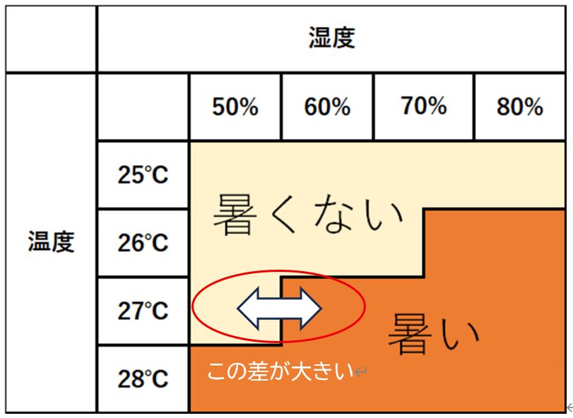 例えば、温度が27℃でも湿度が50%なら不快とは感じませんが、湿度が60%を超えると多くの人が暑いと感じます。