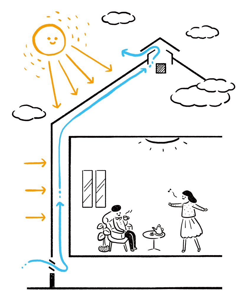 WBハウスの第2通気層は、温度が上がりにくい床下から冷えた空気を取り込み、室内に侵入しようとする熱を上昇気流に乗せて、棟に設けた排出口から抜くのです。
