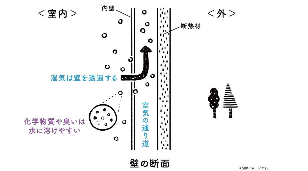WBハウスは24時間換気をせずとも、壁の調湿作用と壁体内の通気効果で、室内の化学物質を厚生労働省の基準値以下に下げることができます。