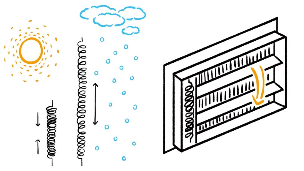 おさらいをすると、WBハウス(通気断熱WB工法)は、壁の中に通気層を設け、外気温に応じて換気口の形状記憶合金が開閉します。